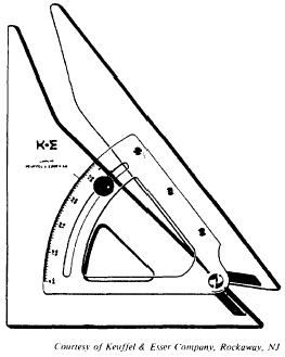 ADJUSTABLE TRIANGLES The ADJUSTABLE TRIANGLE, shown in figure 2-13, combines the functions of the triangle and the protractor. When it is used as a right triangle, the hypotenuse can be set and locked at any desired angle to one of the bases. The transparent protractor portion is equivalent to a protractor graduated in 1/2 increments. The upper row of numbers indicates angles from 0 to 45 to the longer base; the lower row indicates angles from 45 to 90 to the shorter base. By holding either base against a T square or straightedge, you can measure or draw any angle between 0 and 90. The adjustable triangle is especially help-ful in drawing building roof pitches. It also allows you to transfer parallel inclined lines by sliding the base along the T square or straightedge. FRENCH CURVES Irregular curves (called FRENCH CURVES) are used for drawing smooth curved lines that are not arcs or circles, such as ellipses, parabolas, and spirals. Transparent plastic french curves come in a variety of shapes and sizes.