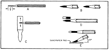 Figure 3-1.-Sharpening pencil points. main purpose of making your first drawings is to learn to use instruments. Each drawing will offer an opportunity for practice. Later on, good form in the use of instruments will become a natural habit.Accurate pencil drawings are of first importance since all inked drawings and tracings are made from finished pencil drawings. It is a mistake to believe that a poor pencil drawing can be corrected when you make the ink tracing. Any drawing important enough to be inked or traced in ink must be accurate, legible, and neat. Because most military and commercial blueprints are made from pencil drawings, ambitious trainees will work to acquire skill in pencil drawing as they perfect their technique. Good technique and skillful pencil drawing are basic to proficiency in drafting.The following sections will guide you in attaching your drawing paper to the board and in drawing basic lines with the T square, triangles, and pencil. |