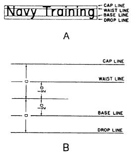 FREEHAND LETTERING As you work with experienced draftsmen, you will notice that their freehand lettering adds style and individuality to their work. They take great pride in their freehand lettering ability. By learning basic letter forms and with constant practice, you will soon be able to do a creditable job of lettering and acquire your own style and individuality. Anyone who can write can learn to letter. As you practice you will steadily improve both your style and the speed with which you can letter neatly. Dont give up if your first attempts do not produce neat lettering. Dont be afraid to ask your supervisor for a few pointers.An understanding of the letter shapes and the ability to visualize them can be accomplished by drawing them until the muscles of your hand are accustomed to the pattern of the strokes that make up the letters. You should be able to draw good letters without consciously thinking of this pattern.Your position and how you hold your pencil will greatly affect your lettering. You should sit up straight and rest your forearm on the drawing board or table. Hold the pencil between the thumb, forefinger, and second finger; the third and fourth fingers and the ball of the palm rest on the drawing sheet. Do not grip the pencil tightly. A tight grip will cramp the muscles in your fingers, causing you to lose control. If you get "writers cramp" easily, you are probably holding your pencil too tightly. The pencil should be kept sharpened to produce uniform line weights. A conical-shaped pencil point works best for most lettering. Usually, an F or H pencil is used for lettering. A pencil that is too hard may cut into the paper, or it may produce lettering that will not reproduce easily. A pencil that is too soft will require frequent sharpening, and it will produce lettering that may smear easily on a drawing.GUIDELINES Figure 3-42, view A, shows the use of light pencil lines called guidelines. Guidelines ensure consistency in the size of the letter characters. If your lettering consists of capitals, draw only the cap line and base line. If lowercase letters are included as well, draw the waist line and drop line.The waist line indicates the upper limit of the lowercase letters. The ascender is the part of the lowercase letter that extends above the body of the letter; for example, the dot portion of the