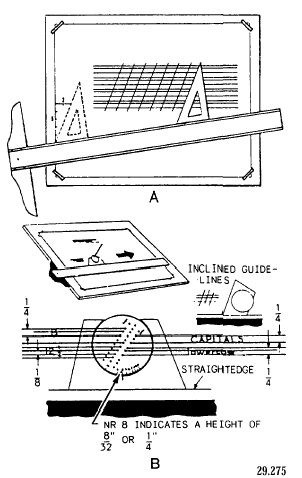 Figure 3-43.-Laying off lines for lettering. direction lines and are normally slanted at a maximum of 68 degrees. |