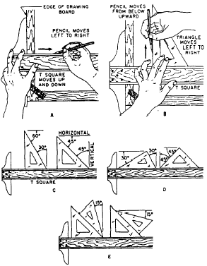Figure 3-3.-Construction of basic lines. edge of a T square, as shown in figure 3-3, view A. This working edge, when true, is perpendicular to the working edge of the drafting board. When you draw horizontal lines, keep the working edge of the T square head in firm contact with the working edge of the drafting board. The pencil should be inclined to the right at an angle of about 60 degrees, with the point close to the junction of the working edge and the paper. Hold the pencil lightly and, if it was sharpened with a conical point, rotate it slowly while drawing the line to achieve a uniform line width and preserve the shape of the point. Normally, when a series of horizontal lines is being drawn, the sequence of drawing is from the top down. |