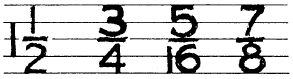 Figure 3-50.-Vertical fractions. The bottom ellipse is two thirds of the height of the figure from the base line.The division bar between the numerator and denominator of the fractions is always drawn parallel to the guidelines, as shown in figure 3-50. The complete height of a fraction is twice that of a whole number. The division bar is centered midway between the base line and cap line. The top guideline of the numerator and the bottom guideline of the denominator are spaced a full number height from the division bar. The numbers composing a fraction are three quarters of the height of a full number. The clear space on either side of the division bar is one quarter of a full number. Numbers in a fraction are centered about a vertical guideline that cuts the fraction bar in half.Lowercase Letters Lowercase letters are never used on construc-tion drawings, although it is acceptable to use them for notes on maps or similar drawings.