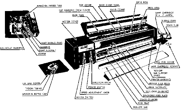 Figure 3-61.-Exploded view of the Blu-Ray Model 842 Whiteprinter. The ammonia supply bottle must be placed below the machine so that there will be a short, direct, and unkinked run of the large ammonia discharge tube. Only the proper aqueous ammonia, as recommended in the operation manual, should be used. Use only fresh ammonia and change it at least once a month for best operation. NEVER reuse the discharged ammonia. Room temperature is important. Blu-Ray manufacturers recommended a room temperature of 70F be maintained. A drop in room temperature will cause condensation in the chest, giving wet prints and may, if excessive, jam the developer. The Blu-Ray is equipped with an ammonia chest heater, which has an independent heater switch. The heater is used to activate the ammonia vapor to improve development when it is necessary. This may be true especially with long, continuous machine operation. The machine must be kept dust-free and clean. Dust is an abrasive material that can wear out the Teflon gate strips in the developer section, as well as other moving parts. OPERATION. A pilot-lighted switch marked POWER on the instrument panel turns the Blu-Ray machine on and off. When it turns the machine on, it actuates the main drive motor and the ammonia pump motor and fan, and it lights the fluorescent tubes. A pilot-lighted switch marked HEATER on the instrument panel manually turns the heater on and off. Two knobs on the instrument panel marked SPEED and DIRECTION manually will give a stepless speed range from 0 to 12 ft per min in both directions. To select the desired speed of operation, manually turn the knob marked SPEED to a number that experience has shown to be proper for the type of paper being printed. The knob marked DIRECTION has a forward and reverse setting. Keep this knob at forward setting at all times. Use the reverse setting only when the paper is jamming and must be instantly removed. This knob can be snapped from forward to reverse while the machine is running. The Blu-Ray may be turned on and off AT ANY TIME. THERE IS NO WARM-UP OR COOL-DOWN PERIOD REQUIRED FOR THIS MACHINE. Just turn on the power switch, make your print, and turn the machine off. This is recommended for longer machine and lamp life. Making prints is extremely simple. Place your original tracing or transparency, face up, on the sensitized reproducing paper, chemical (yellow) side up. Adjust the leading edges of both papers so they are even, uncurled, and uncreased. THIS IS IMPORTANT! Place the two adjusted sheets on the feed table and gently feed them evenly into the printer entrance WITH THE GRAIN of the sensitized paper (see package for grain indication) until they are engaged between the rubber belts and the glass cylinder. If for any reason the above described entrance of the paper to the printer is erratic, creased, wrinkled, or uneven, turn the direction knob to reverse and the papers will come out of the printer. As the original and printed sensitized paper exits from the printer over the top of the glass cylinder, manually separate the sensitized paper from the original tracing. Turn the sensitized paper up and into the entrance of the ammonia developing chest. The finished print will exit from the top of the machine. If your print is too light, turn the speed knob to a higher number; if too dark, turn to a lower number. The interior of the ammonia chest of the Blu-Ray machine is readily accessible for inspection or removal of jammed paper. Using finger catches on the top of the machine, lift up the top cover, and the upper chest panel will be exposed. (Before opening, SEE WARNING below.) Two sliding door latch-type fasteners hold the upper chest panel in its closed position. Slide these door latches toward the center of the machine, and open the upper chest panel up and back, exposing the interior of the ammonia chest. |