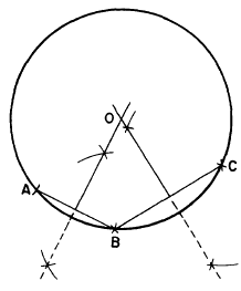 Figure 4-31.-Circle or arc through three points. B, and C. Connect the points by lines and erect perpendicular bisectors as shown. The point of intersection of the perpendicular bisectors (O) is the center of the circle or arc passing through all three points. |