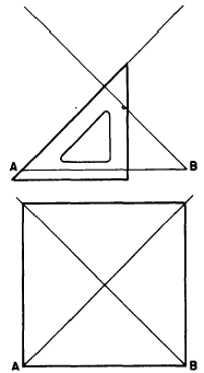 AND WIDTH To construct a rectangle with a given length and width, draw a horizontal line AB, equal to the given length. With a straightedge and triangle, erect perpendiculars from A and B, each equal to the given width. Connect the ends of the perpendiculars.SQUARE: GIVEN LENGTH OF SIDE You can construct a square with a given length of side by the method described for constructing a rectangle. Another method is shown in figure 4-18. With a T square, draw horizontal line AB equal to the given length of side. With a T square and a 45 triangle, draw diagonals from A and B at 45 to AB. Erect perpendiculars from