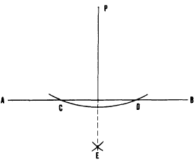 Figure 4-3.-Dropping a perpendicular from a given point to a line. Figure 4-3 shows a method of dropping a perpendicular from a given point to a line, using a compass. To drop a perpendicular from point P to AB, set the needlepoint of the compass at P and strike an arc intersecting AB at C and D. With C and D as centers and any radius larger than one-half of CD, strike arcs intersecting at E. A line from P through E is perpendicular to AB.Figure 4-4 shows a method of erecting a perpendicular from a given point on a line. To erect a perpendicular from point P on AB, set a compass to any convenient radius, and, with P as a center, strike arcs intersecting AB at C and D. With C and D as centers and any radius larger than one-half of CD, strike arcs intersecting at E. A line from P through E is perpendicular to AB. |