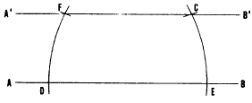 Figure 4-2.-Drawing a parallel line at a given distance from another line.when the second line is to be drawn at a given distance from the first. To draw a line parallel to AB at a distance from AB equal to CD, set a compass to the length of CD, and, from any points E and F on AB, strike two arcs. A line AB drawn tangent to (barely touching) the arcs is parallel to AB, and located CD distance from AB.In the preceding chapter, you learned how to draw a line perpendicular to another by the use of a straightedge and a triangle. Two other methods of solving this problem are explained below.
