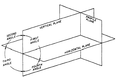 Figure 5-4.-Primary (principal) planes of projections. is normally placed between the point of sight and the object. For the purpose of studying any type of projection, it must be assumed that the planes of projection are in fixed positions. Once the object is placed in a definite imagined position, it should never be changed. If a different view of the object is desired, the location of the point of sight is changed.The PROJECTION LINES (or LINES OF SIGHT) are the imaginary lines from the eye of the viewer (point of sight) to points on the object (fig. 5-2). By the use of projection lines, points on the object are projected on the image plane. These points are the points at which the projection lines appear to pierce the image plane. By the projection of the prominent points, lines, and surfaces of an object, a complete view of that object can be projected on the plane of projection.The relationship between the point of sight (station point), the plane of projection (image plane), the projection lines (lines of sight), and the manner in which they are used for each individual type of projection will be discussed in the following sections. |