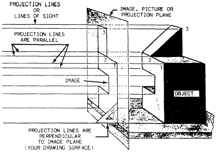 view requires a new point of sight. The observer views the features of the object through an imaginary PLANE OF PROJECTION (or IMAGE PLANE). In parallel projection, this theoretical transparent plane is placed between the point of sight and the object, as shown in figure 5-2. For perspective pictorials, it