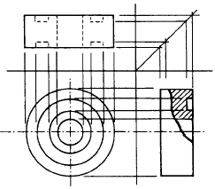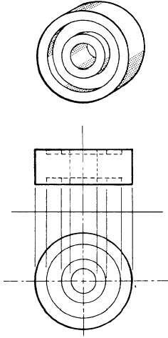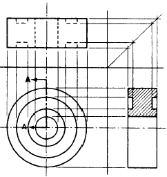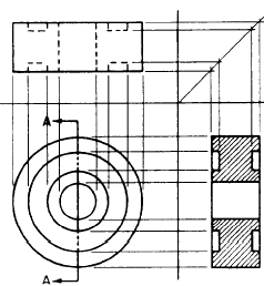 the horizontal plane of projection. SECTIONING TECHNIQUES. A sectional view is called for when the internal structure of an object can be better shown in such a view than it can by hidden lines. In the upperpart of figure 5-30, there is a single-view projection of a pulley. The same object is shown below in a two-view multi-view projection. The internal structure of the pulley is shown by the hidden lines in the top view.In figure 5-31, the internal structure of the pulley is much more clearly shown by a sectional view. Note that hidden lines behind the plane of projection of the section are omitted in the