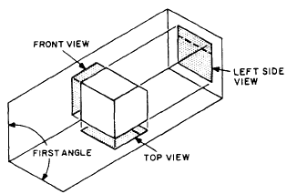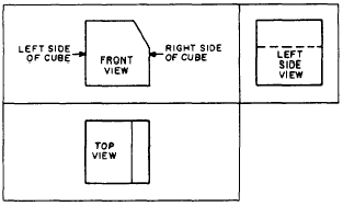 Figure 5-6.-Firsl-angle projection brought into a single plane. shown in figure 5-5. The cube is supposed to be fronting toward the vertical plane of projection. As you can see, you get a front view on the vertical plane, a left side view on the profile plane, and a top view on the horizontal plane.Now, to put these views on a sheet of drafting paper, you must get them all into the same plane. You presume that the vertical plane of projection is already in the plane of the paper. To get the other two views into the same plane, you rotate the profile plane counterclockwise and the horizontal plane clockwise. The projection now appears as shown in figure 5-6.This first-angle projection arrangement of views is considered satisfactory in most European drafting practice. In the United States, it is considered illogical because the top view is below the front view; because the right side of the object, as shown in the front view, is toward the left side view of the object; and because the bottom of the object, as shown in the front view, is toward the top view of the object. For these and other reasons, first-angle projection is not used much in the United States. |