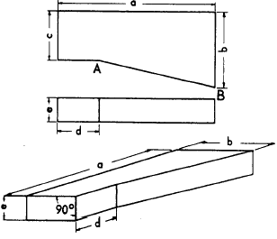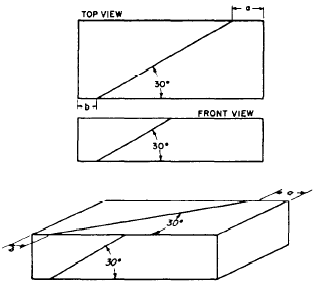 Figure 5-53.-Cavalier projection of an object with irregular lines. two-view multi-view projection of a block; the line AB is an irregular line and will not appear in its true length in an oblique projection. To transfer the line, you draw the projection by transferring measurements taken along regular lines; these measurements locate the end points of the irregular line. Figure 5-53 shows the cavalier projection of an irregular line. The procedure for cabinet projection would be the same except that all measurements along the receding axis would be reduced by one half.ANGLES IN OBLIQUE. In an oblique projection, an angle on the surface that is parallel to the plane of projection will appear in its true