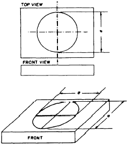 Figure 5-55.-Cavalier projection of a circle on a receding surface. the object. This type of projection, however, cannot accurately convey the structural features of a building; hence, it is not adequate for working drawings.On the other hand, of all the three-dimensional single-plane drawings, PERSPECTIVE DRAWINGS are the ones that look the most natural. At the same time, they are also the ones that contain the most errors. Lines that have the same length on the object have different lengths on the drawing. No single line or angle on the drawing has a length or size that has any known relationship to its true length or size when projected through perspective projections.Perspective drawing is used only in drawings of an illustrative nature, in which an object is deliberately made to appear the way it looks to the human eye. Most of the drawings you will prepare will be drawings in which accuracy, rather than eye appearance, will be the chief consideration. Consequently, you will not be concerned much with perspective drawing.If you are required to prepare perspective drawings, refer to as Architectural Graphic Standards.SKETCHING The EA who is able to make quick, accurate SKETCHES will find this ability a valuable asset when it comes to conveying technical information or ideas. Without this ability you are handicapped in many of your day-to-day situations. Almost every drawing or graphic problem originates with a sketch. The sketch becomes an important thinking instrument, as well as a means of conversing effectively with technically trained people. Sketching is not just another trick of the trade; it is a skill that is essential and should be an important part of your training. To gain proficiency in freehand sketching, invite situations entailing sketching at every opportunity. Do not worry about your first attempts at sketching; appearance will improve with experience.A sketch is usually thought of as being made freehand, although in practice you may use graph paper or a small triangle for a straightedge. A sketch may be of an object or an idea or a combination of both. Sketches are used to solve graphic problems before an object or structure is put in final form on a drawing. Preliminary sketches are used to plan and organize intelligently the sheet layout of a complete set of drawings for a construction project, which often includes many views and details. There are no set standards for technical freehand sketching; however, you should use standard line conventions for clarity.A sketch may be drawn pictorially so that it actually looks like the object, or it can be an orthographic sketch of the object showing different views. The degree of perfection required for any sketch will depend upon its intended use. |
