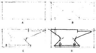 Construction Lines When you are sketching an object, such as that shown in figure 5-67, dont start at one corner and draw it detail by detail and expect it come out with the various elements in correct proportion. It is better to block in the overall size of the object first, (See fig. 5-67, view A.) Then draw light guidelines at the correct angles for the various outlines of the object. (See fig. 5-67, views B and C.)Finish the sketch by first making an outline of the object and then drawing in the details, as shown in figure 5-67, view D.Order of Sketching To make a working sketch, first choose a clean sheet of paper, either plain or ruled. Estimate the size the sketch should be, and select the views that will give the best picture of the object. Then draw the ORTHOGRAPHIC PROJECTIONS of these views, leaving adequate space between them for