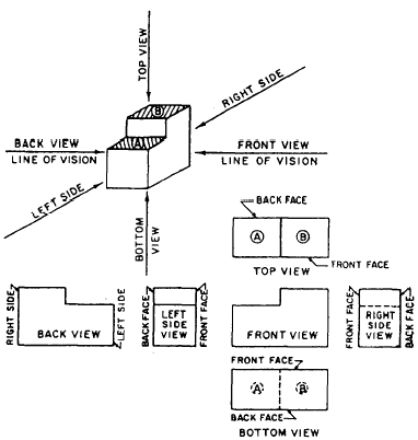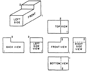 Figure 5-18.-Procedure for numbering hidden and visible corner points.of which view you are considering. This means that, in a third-angle projection, each view of a surface of an object is a view of that surface as it would appear to an observer looking directly at it.Figure 5-17 shows a six-view multi-view third-angle projection of the block shown in a single-view projection in the upper left corner of the figure. You should not have any trouble analyzing the front view; you know that the top is up, the bottom is down, the left side is to the left, and the right side is to the right. |
