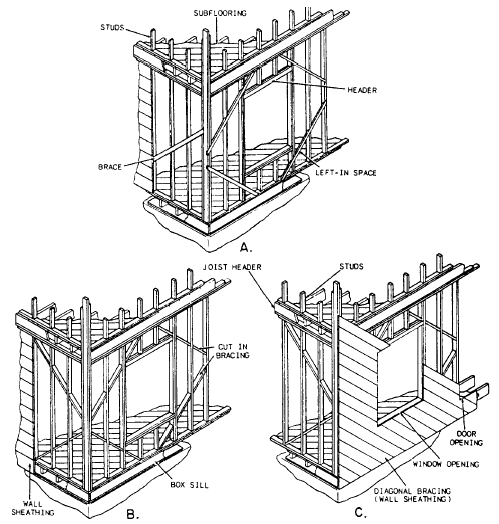 WALL FRAMING As with floor construction, two general types of wall framing are commonly used: platform construction and balloon-frame construction. The platform method shown in figure 6-9 is more often used because of its simplicity.A typical wall frame (fig. 6-20) is composed of regular studs, cripples, trimmers, headers, and fire stops (fig. 6-10) and is supported by the floor soleplate, The wall framing members used in conventional construction are generally nominal 2 by 4 in. in size. The requirements are good stiffness, good nail-holding ability, freedom from warp, reasonable dryness (about 15-percent moisture content), and ease of working. The closely spaced and slender vertical members of the wall framing are called the STUDS. They support the top plates and provide the framework to which the wall sheathing is nailed on the outside and which supports the lath, plaster, and insulation on the inside. TOP PLATES (or CAPS) are horizontal wood framing members that are nailed to the tops of the wall or partition studs.SOLEPLATES are horizontal wood framing members that serve as nailing bases for studs in platform-framing construction. HEADERS form the upper members of a rough doorframe, or upper or lower members of a rough window frame. Similar members that form the ends of a rough floor or roof opening (as a skylight) are also called headers.Partition The inside space of a building is divided by partition walls. In most cases, these walls are framed as part of the building. There are two types of partition walls: BEARING and NONBEARING. Partition walls of the bearing type support the ceiling joists and all other loads imposed upon them; those of the nonbearing type support only themselves and are usually installed after the other framework is put in. Partition walls are framed in the same manner as outside walls, and door openings are framed as outside openings. CORNER POSTS or T-POSTS are used at corners or where one partition wall joins another. They provide nailing surfaces for the inside wall finish (fig. 6-21).