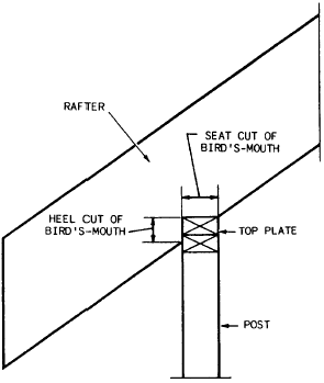 Figure 6-27.-Birds-mouth on a rafter with projection. ridgeboard or, if the ridgeboard is omitted, against the opposite rafters (fig. 6-25). |