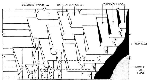 Figure 6-43-A typical building paper and felt on five-ply built-up roof. three standard lengths: 16, 18, and 24 in. The 16-in. length is perhaps the most popular. Wood shakes are applied in much the same manner as wood shingles. On flat roofs, the roof covering is usually built up. BUILT-UP ROOFING consists of several layers (plies) of felt, set in a hot binder of melted pitch or asphalt. Built-up roofs are always designated by the number of plies they contain. A five-ply built-up roof is shown in figure 6-43, Notice that aggregate surfacing materials, such as gravel, slag, marble, and other suitable materials, are used in built-up roofing to provide a good weathering surface and protect the bitumens from sunlight and external heat. |