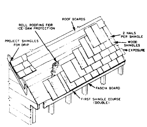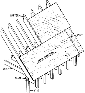 Figure 6-39.-Typical board roof sheathing, showing both closed and spaced types. roofing materials that require continuous support should be laid closed (without spacing); however, when wood shingles or shakes are used in damp climates, it is common to have spaced roof boards (fig. 6-39). When plywood roof sheathing is used, it should be laid with the grain perpendicular to the rafter (fig. 6-40). Roof covering materials used for pitched roofs are wood, asphalt shingles, tiles and slate, galvanized iron (GI) sheets, and several other sheet materials. For flat or low-pitched roofs, a built-up construction is also used. An asphalt-saturated felt underpayment called ROOFING FELT is applied over the roof sheathing before the roof covering is installed. The roofing felt serves three basic purposes: It keeps the roof sheathing dry until the shingles can be applied, it acts as a secondary barrier against wind-driven rain and snow, and it protects the shingles from any resinous substance that may be released from the sheathing. The method of laying an asphalt-shingle roof is shown in figure 6-41. The roofing rolls are usually 36 in. wide with a 2 in. to 4 in. overlap. The shingles are usually laid with 5 in. exposed to the weather. Figure 6-42 shows installation of wood shingles. Wood shingles are available in