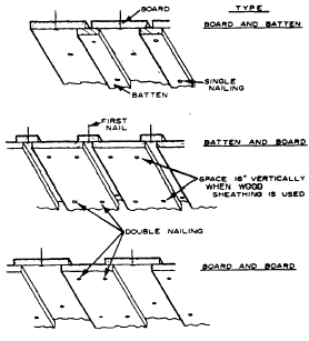 Figure 6-52.-Vertical board siding. may be used in either manner if adequate nailing areas are provided. Figure 6-52 shows a method of vertical siding application. Masonry veneers are used effectively with wood sidings in various exterior finishes to enhance the aesthetic appearance of the structure. Other non-wood materials, such as stucco or a cement plaster finish, are favored for an exterior cover because they require a minimum of maintenance. Plastic films on wood sidings or plywood are also used because little or no refinishing is necessary for the life of the building. |