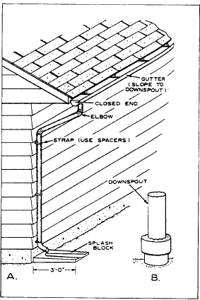 Figure 6-58-Use of gutter and downspout: A. Downspout with splash block; B. Drain to storm sewer.