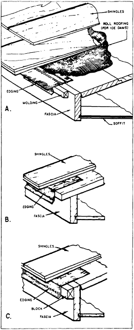 Figure 6-57.-Cornice flashing: A. Formed flashing; B. Flashing without wood blocking; C. Flashing with wood blocking.