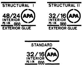 Figure 6-8.-Structural and standard sheathing identification symbols.The actual grade is NOT given, NOR is the species group. The index numbers 48/24 and 32/ 16 give the maximum spacing in inches of supports. The number to the left of the slash is the maximum O.C. (on-center) spacing of supports for roof decking. The number to the right of the slash is the maximum O.C. spacing of supports for subfloors. A number 0 on the right of the slash indicates that the panel should NOT be used for subflooring. No reference to the index number is needed when the panel is to be used for wall sheathing.Detailed information on specific types and grades and their uses can be found in commercial standards for the manufacture of plywoods established by the U.S. Department of Commerce. General plywood characteristics and architectural information can be found in the following publications: National Lumber Manufacturing Association, or the Architectural Graphic Standards. The latter book can be found in your units technical library. |
