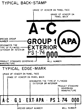 Identification Stamps Stamps are placed on the edges and back of each sheet of plywood so it can be properly identified. Figure 6-7 shows typical back-stamps and edge-marks found on a standard sheet of plywood. It shows all information needed about the sheet, except its actual size.Figure 6-8 shows the stamps found on the backs of structural and standard sheathing panels. They vary somewhat from the standard stamps.