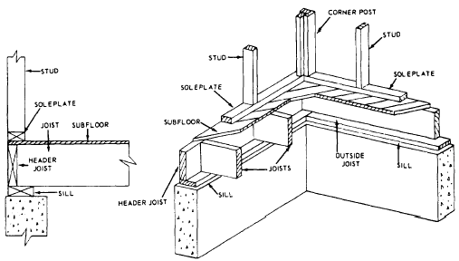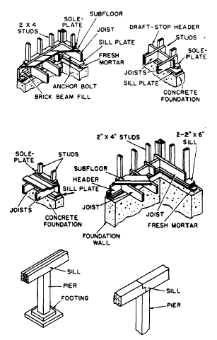 SILL FRAMING AND LAYOUT The lowest horizontal wood frame structural member is the SILL, a piece of dimensional lumber laid flat and bolted down to the top of the foundation pier or wall. It is the first part of the frame to be set in place and provides a nailing base for the other adjoining members. It may extend all around the building, joined at the corners and spliced when necessary.The type of sill assembly selected depends upon the general type of construction methods used in the framework. The method of framing