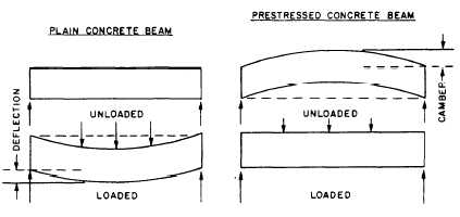 Figure 7-19.-Comparison of plain and prestressed concrete beams. lightweight aggregates, such as expanded shale, clay, or slag. Concrete containing aggregates like perlite or vermiculite is very light in weight and is primarily used as insulating material. Light-weight concrete is usually classified according to its weight per cubic foot.Semi-lightweight concrete has a unit weight of 115 to 130 lb per cubic foot and an ultimate compressive strength comparable to normal concrete. Sand of normal weight is substituted partially or completely for the lightweight fine aggregate.Insulating lightweight concrete has a unit weight ranging from 20 to 70 lb per cubic foot, and its compressive strength seldom exceeds 1,000 psi. This type of concrete is generally used for insulating applications, such as fire-proofing. Structural lightweight concrete has a unit weight up to 115 lb per cubic foot and a 28-day compressive strength in excess of 2,000 psi. This type is used primarily to reduce the dead-load weight in concrete structural members, such as floors, walls, and the roof section in high-rise structures.Heavyweight Concrete Heavyweight concrete is produced with special heavy aggregates and has a density of up to 400 lb per cubic foot. This type is used principally for radiation shielding, for counterweights, and for other applications where higher density is desired. Except for density, the physical properties of heavyweight concrete are similar to those of normal- or conventional-weight concrete.TILT-UP CONSTRUCTION Tilt-up concrete construction is a special form of precast concrete building. This method consists basically of jobsite prefabrication, in which the walls are cast in a horizontal position, tilted to a vertical position, and then secured in place. Tilt-up construction is best suited for large one-story buildings, but it can be used in multistory structures. Usually, multistory structures are built by setting the walls for the first story, placing the floor above, then repeating the procedure for each succeeding floor. An alternate method is to cast two- to four-story panels.The wall panels are usually cast on the floor slab of the structure. Care must be exercised to ensure the floor slab is smooth and level and that all openings for pipes and other utilities are temporarily plugged. The casting surface is treated with a good bond-breaking agent to ensure the panel does not adhere when it is lifted.Reinforcement of Tilt-Up Panels The steel in a tilt-up panel is set in the same manner as it is in a floor slab. Mats of reinforce-ment are placed on chairs and tied as needed. Reinforcement should be as near the center of the panel as possible. Reinforcing bars are run through the side forms of the panel. When welded wire fabric or expanded wire mesh is used, dowel bars are used to tie the panels and their vertical supports together. Additional reinforcement is generally needed around openings.The panel is picked up or tilted by the use of PICKUP INSERTS. These inserts are tied into the reinforcement. As the panel is raised into its vertical position, the maximum stress will occur; therefore, the location and number of pickup inserts is extremely important. Some engineering manuals provide information on inserts, their locations, and capacities.Tilt-Up Panel Foundations An economical and widely used method to support tilt-up panels is a simple pad footing. The floor slab, which is constructed first, is NOT poured to the perimeter of the building to permit excavating and pouring the footings. After the panel is placed on the footing, the floor slab is completed. It may be connected directly to the outside wall panel, or a trench may be left to run mechanical, electrical, or plumbing lines.Another method that is commonly used, as an alternative, is to set the panels on a grade beam or foundation wall at floor level. Regardless of the type of footing, the panel should be set into a mortar bed to ensure a good bond between the foundation wall and the panel. |