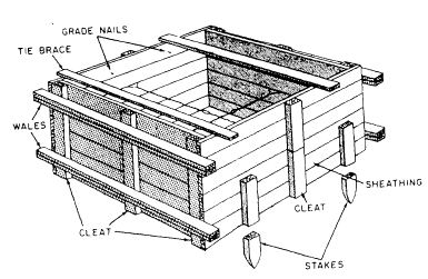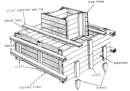 Figure 7-27.-Typical footing and pier form. spaces enclosed by previously constructed FORMS. These forms are usually removed once the plastic concrete hardens into the shape outlined by the forms.Forms for concrete structures must be tight, rigid, and strong. If the forms are NOT tight, loss of water and paste may cause sand streaking as well as weakness to the concrete. The forms must be strong enough to resist the high pressure exerted by the concrete. |