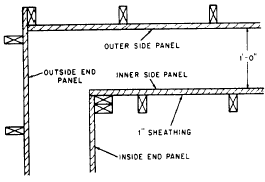 Figure 7-33.-Method of joining wall form panels at a corner.them off the inner sections of rod with a special wrench leaving the cone-shaped surface holes. The outer sections and the cone nuts may be reused indefinitely.The use of prefabricated panels for formwork has recently been on the increase. These panels can be reused many times, thus reducing the time and labor required for erecting forms on the site. |