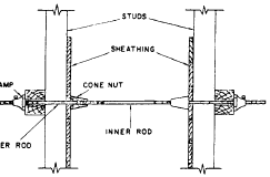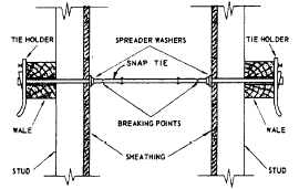 Figure 7-31.-Snap tie. forms.simple wire ties, used with wood SPREADERS, are shown in figure 7-30. The wire is passed around the studs and wales and through small holes bored in the sheathing. The spreader is placed as close as possible to the studs, and the tie is set taut by the wedge shown in the upper view or by twisting with a small toggle, as shown in the lower view. When the concrete reaches the level of the spreader, the spreader is knocked out and removed. The parts of the wire that are inside the forms remain in the concrete; the outside surplus is cut off after the forms are removed.Wire ties and wooden spreaders have been largely replaced by various manufactured devices that combine the functions of the tie and spreader. Figure 7-31 shows one of these, called a SNAP TIE. These ties are made in various sizes to fit various wall thicknesses. The tie holders can be removed from the tie rod. The rod goes through small holes bored in the sheathing and also through the wales, which are usually doubled for that purpose. Tapping the tie holders down on the ends of the rod brings the sheathing to bear solidly against the spreader washers. After the concrete has hardened, the tie holders can be detached to strip the forms. After the forms are stripped, a special wrench is used to break off the outer sections of rod; they break off at the breaking points, located about 1 in. inside the surface of the concrete. Small surface holes remain, which can be plugged with grout, if necessary.Another type of wall form tie is the TIE ROD, as shown in figure 7-32. The rod in this type consists of three sections: an inner section, which is threaded on both ends, and two threaded outer sections. The inner section, with the cones set to the thickness of the wall, is placed between the forms, and the outer sections are passed through the wales and sheathing and threaded into the cone nuts. The clamps are then threaded up on the outer sections to bring the forms to bear against the cone nuts. After the concrete hardens, the clamps are loosened, and the outer sections of rod are removed by threading them out of the cone nuts. After the forms are stripped, the cone nuts are removed from the concrete by threading