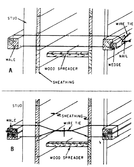 Wall Forms Wall forms are made up of five basic parts. They are as follows: (1) sheathing, to shape and retain the concrete until it sets; (2) studs, to form a framework and support the sheathing; (3) wales, to keep the form aligned and support the studs; (4) braces, to hold the forms erect under lateral pressure; and (5) ties and spreaders or tie-spreader units, to hold the sides of the forms at the correct spacing (fig. 7-29).Wall forms may be built in place or pre-fabricated, depending on the shape and the desirability for reuse.Wall forms are usually reinforced against displacement by the use of TIES. Two types of