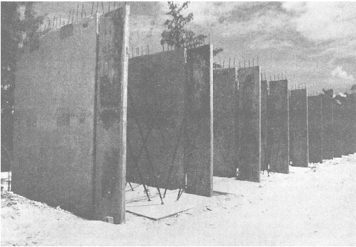 Figure 7-18.-Precast panels in position. are called PURLINS. The cross sections of these beams are shaped like a T or an I. The ones with the inverted T-sections are usually used in composite construction where they support cast-in- place floor or roof slabs. BEAMS and GIRDERS are terms usually applied to the same members, but the one with the longer span should be referred to as the girder. Beams and girders may be conventional precast design or prestressed. Most of the beams will be I-shaped unless the ends are rectangular. The T-shaped ones can also be used. Precast concrete COLUMNS may be solid or hollow. If the hollow type is desired, heavy card-board tubing should be used to form the core. A looped rod is cast in the column footing and projects upward into the hollow core to help hold the column upright. An opening should be left in the side of the column so that the column core can be filled with grout. This causes the looped rod to become embedded to form an anchor. The opening is dry packed. |