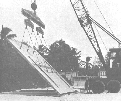 Figure 7-17.-Precast panels being erected by use of crane and spreader bars.
