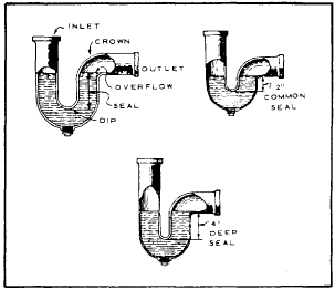 Joints and Connections Various types of joints and connections used in waste drainage systems are described below.LEAD AND OAKUM JOINT, COMPRESSION JOINT, AND NO-HUB JOINT. These types of joints (fig. 8-17) are used to connect cast-iron soil pipes (CISP) and fittings. In lead and oakum joints, oakum (made of hemp impregnated with bituminous compound and loosely twisted or spun into a rope or yarn) is packed into the hub completely around the joint, and melted lead is poured over it (fig. 8-17, view A). In compression joints, an assembly tool is used to force the spigot end of the pipe or fitting into the lubricated gasket inside the hub (fig. 8-17, view B). A no-hub joint uses a gasket on the end of one pipe and a stainless steel shield and clamp assembly on the end of the other pipe (fig. 8-17, view C).MORTAR OR BITUMINOUS JOINTS. This type of joint is common to vitrified clay and concrete pipes and fittings. Mortar joints may be made of grout (a mixture of cement, sand, and water).The use of SPEED SEAL JOINTS (rubber rings) in joining vitrified clay pipe has become widespread. Speed seal joints eliminate the use of oakum and mortar joints for sewer mains. This type of seal is made a part of the vitrified pipe joint when manufactured. It is made of polyvinyl chloride and is called a plastisol joint connection.Traps A trap is a device that catches and holds a quantity of water, thus forming a seal that prevents the gases resulting from sewage decomposition from entering the building through the pipe. A number of different types of traps are available; however, the trap mainly used with plumbing fixtures is the P-TRAP (fig. 8-18). It comes in sizes from 1 1/4 in. to 6 in. in diameter. P-traps are usually made of nickel or chrome-plated brass, malleable galvanized or wrought iron, copper, other metal alloys, and plastic.
