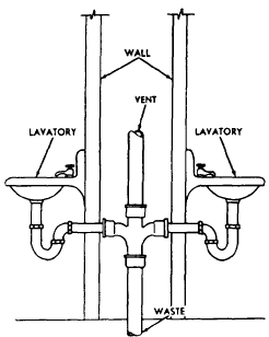 Figure 8-20.-Two fixture units sharing a common vent. A COMMON VENT vents two traps to a single vent pipe, as shown in figure 8-20. The unit vent can be used when a pair of lavatories is installed side by side, as well as when they are hung back to back on either side of a partition (as shown in the figure). A point to note is that the waste from both fixtures discharges into a double sanitary tee. |