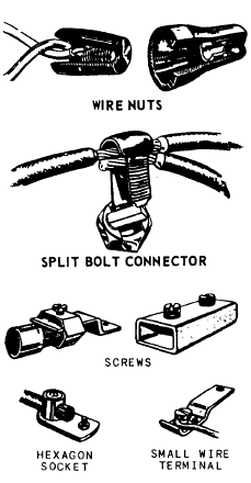 connecting pipe to pipe to boxes. FLEXIBLE CONDUIT. Flexible conduit (fig. 9-15, view C), also called Greenfield, is a spirally wrapped metal band wound upon itself and interlocking in such a manner as to provide a round cross section of high mechanical strength and flexibility. It is used where rigid conduit would not be feasible to install and requires no elbow fittings. It is made in sizes from 1/2 to 3 in. in diameter. Greenfield is available in two types: the plain or standard unfinished-metal type and a moisture-resistant type called sealtite, which has a plastic or latex jacket. The moisture-resistant type is not intended for general use but only for connecting motors or portable equipment in damp or wet locations and where flexibility of connections is desired.Wire Connectors Figure 9-16 shows various types of connectors that are used to join or splice conductors. The type used will depend on the type of installation and the wire size. Most connectors operate on the same principle, that of gripping or pressing the conductors together. WIRE NUTS are used extensively for connecting insulated single conductors installed inside of buildings.Outlet Boxes OUTLET BOXES bind together the elements of a conduit or cable system in a continuous