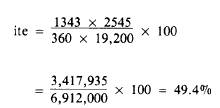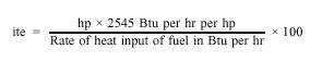 For example, assume that the same engine used as an example in computing ihp consumes 360 pounds (approximately 50 gallons) of fuel per hour, and that the fuel has a value of 19,200 Btu per pound. What is the ite of the engine? The work done per hour when 1343 ihp are developed is 1343 2545 or 3,417,935 Btu. The heat input for the same time is 360 19,200 or 6,912,000 Btu. Then, by the above expression, the indicated thermal efficiency is as follows: