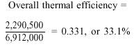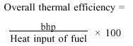 Converting these factors into the same units (Btu), the expression is written as power output in Btu divided by fuel input in Btu. For example, if the engine used in the preceding problem delivers 900 bhp (determined by the manufacturer) what is the overall thermal efficiency of the engine? 1 hp-hr = 2545 Btu 900 bhp 2545 Btu per hp-hr = 2,290,500 Btu output per hr Substituting factors already known, overall thermal efficiency is computed as follows: