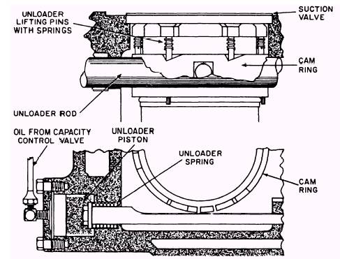 CONTROL Controlling the capacity of the compressor is accomplished by unloading and loading the cylinders. This is a very desirable design feature of the unit, because if the compressor is to be started under a load (all cylinders are working), there is a much greater amount of torque required and it is necessary to have a much larger drive motor. Also, if the compressor is running at a constant capacity or output, it will reach the low temperature or pressure limits and will be constantly starting and stopping, thereby putting excessive work on the unit. Unloading of the cylinders in the compressor is accomplished by lifting the suction valves off their seats and holding them open. This method of capacity control unloads the cylinders completely and allows the compressor to work at as little as 25% of its rated capacity. Unloader Mechanism When the compressor is not in operation, the unloader power element mechanism, which is operated by oil pressure from the capacity control valve, is in the unloaded position (figure 6-6). The unloader spring pushes against the unloader piston. This action moves the unloader rod to the left, thereby rotating the cam rings. As the cam rings are rotated, the lifting pins are forced up-ward, raising the suction valve off its seat. The suction valve is held in this position until the compressor is started and oil pressure of approximately 30 psi is reached. At this time, the oil pressure from the capacity control valve pushes the unloader piston back to the right against the unloader spring. The motion transmitted through the push rod rotates the cam ring, thus lowering the lifting pins and allowing the suction valve to close or operate normally and the cylinder to become loaded (figure 6-7). On most compressors unloaders are connected to the cylinders in pairs.