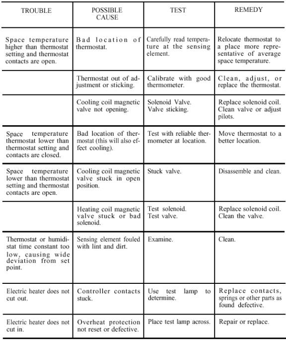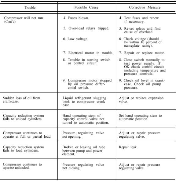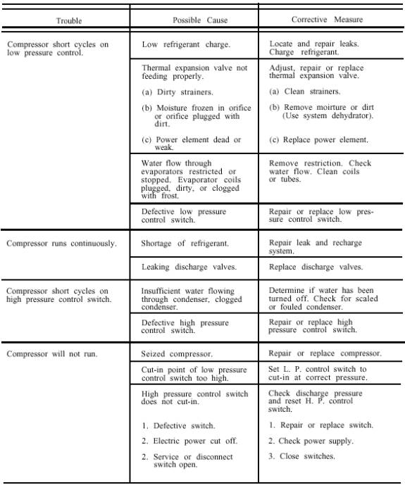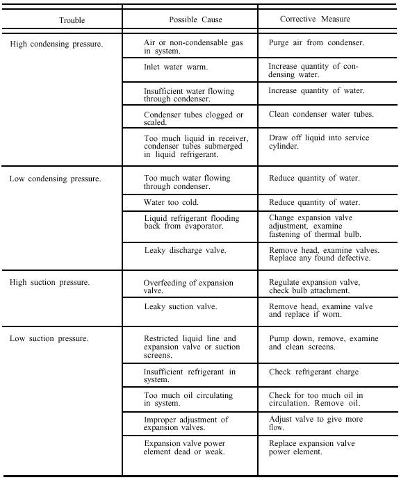 AND CORRECTING TROUBLES Faulty operation of the refrigerating and air conditioning plants is indicated by various definite symptoms. Information in figures 6-12 and 6-13 indicates some possible troubles that may be en-countered, the possible causes of these troubles, and the corrective action which may be taken. But remember always consult the manufacturers technical manual before attempting any repair or adjustment on your equipment.
