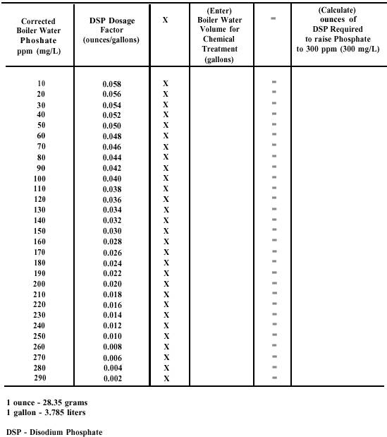 (ounces per gallon) for all values of alkalinity. The boiler volume is multiplied by the factor and the dosage of TSP is entered to the nearest one-half ounce in the appropriate space. The increase in phosphate due to TSP is given in the last column. The DSP dosages are calculated similarly using the DSP factors (ounces per gallon) given in table 7-5. TSP and DSP dosages for the aux-iliary boilers are given in tables 7-6 and 7-7. The procedures for determining the chemical treatment Table 7-4.Trisodium Phosphate Dosage For Natural Circulation Auxiliary Boilers (Trisodium Pbosphate, Dodecahydrate, Na3 PO4 12H2 0)