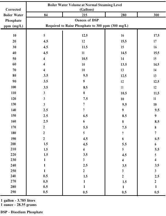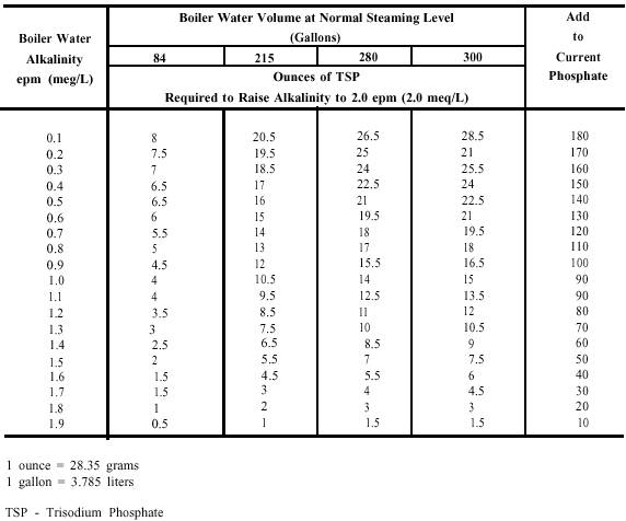 dosages for the completed dosage tables are described below: 1. Determine the alkalinity and phosphate concentrations in the boiler water from sample results. 2. Locate the boiler water alkalinity in the first column of table 7-4. Then read across to the weight of TSP required for the correct volume. (Use table 7-6 for the vessels listed earlier in the chapter.) Enter this weight in the log. Table 7-6.Calculated Trisodium Phosphate Dosages For Some Natural Circulation Auxiliary Boilers (Trisodium Phosphate, Dodecahydrate Na3 Po4 12H2 O)