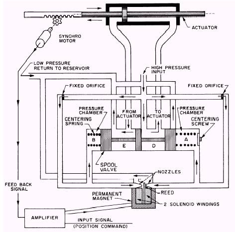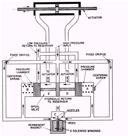 Figure 7-4.Servovalveneutral. most commonly used when fine control is desired is the servovalve (servocontrol). Servocontrol may be defined as a control actuated by a feedback system which compares the output signal with the input or reference signal and makes corrections to reduce the differences. The feedback signal may be provided by fluid pressure, mechanical linkage, electrical signal, or a combination of the three. One type of hydraulic servovalve is illustrated in figure 7-4. The valve is controlled by two solenoids through an amplifier which energizes either the right or left solenoid, depending on the input signal. The valve shown in figure 7-5 has the right solenoid energized; this causes the reed to block the right nozzle and causes a pressure increase in chamber A. The increased pressure causes the spool valve to start sliding to the left. As the spool valve moves, it uncovers the high pressure line to chamber D (right side of the piston) and the return line from the left side of the piston through chamber E (nonpressure side of the hydraulic system). The synchromotor is geared to the actuator shaft. As the actuator moves to the left, the synchromotor rotates and produces a feedback signal to the amplifier. When the feedback signal and the input signal are matched, the solenoid is deenergized and the magnetic reed returns to the neutral position. With