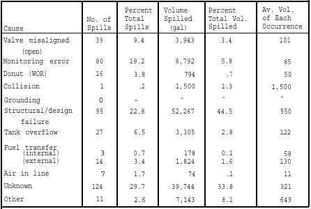 OF OIL SPILLS The frequency of occurrence and the volume of oil spilled in relation to the various causes as reported to, and compiled by, the Navy Environ-mental Support Office (NESO) is shown in table 8-3. You can clearly see that human error is involved in the majority of these spills. The best way to help cope with this problem of human error is through the proper training of operational personnel. This should include study of pertinent regulations and operational procedures; adherence to the Personnel Qualifica-tion System (PQS) and periodic drills involving cleanup procedures and operation of oil spil1 cleanup equipment. In addition to routine and schedule maintenance, as well run facility should perform and log periodic inspections dealing with the Table 8-3.Navy Related Oil Spills by Cause (1975)