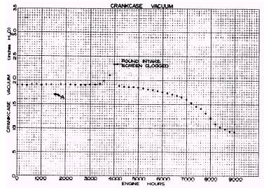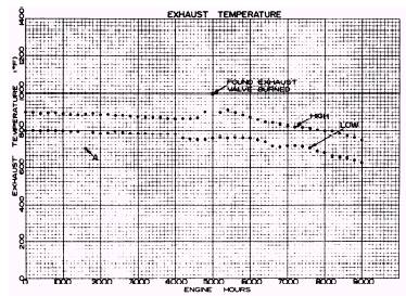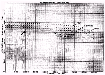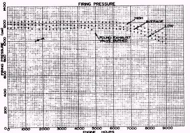 that may be expected are also included. On figures 2-8 and 2-9, a high, average, and low value is plotted for both firing and compression pressures. Under normal conditions these curves will remain flat until the engine is approaching the time of overhaul, then the curves will start to fall off. The high and low firing pressures will remain at about 50 psi (100 psi spread) from the average firing pressure for a well-balanced engine. If you look at figure 2-8 you can see that a decided drop in firing pressure has occurred at 1600 hours (point A). This failure in the compressing pressures indicates that the rings are either sticking, broken, or beginning to wear; that the valves are not functioning properly; or that the liner is beginning to score or possibly that a piston has cracked. Remember that any change in a curve (beyond normal limits) indicates that immediate attention is required. At this point, it should be pointed out that more than one indicator will usually reveal the same distress signal. Therefore, before any corrective action is taken, it is best to make a study of other curves to deny or confirm the problem. In this case check the lube oil consumption, crankcase vacuum, and exhaust temperature curves. In figures 2-9, 2-10, and 2-15 the typical indications for this problem