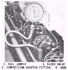 Figure 3-2.Trapped Pressure Indicator (small boat). only on engines installed on small boats. Engines like the GM-6-71 do not have indicator cocks installed. When taking compression readings on a 6-71 engine, you will perform the following steps: 1. Check the manufacturers technical manual for the minimum compression pressure required for the engine. 2. Start the engine and run it at approximately one-half the rated load until normal operating temperatures are reached. 3. Stop the engine and remove the fuel pipes from the injector and the fuel connectors on the cylinder to be tested. 4. Remove the injector and install the indicator adapter, with pressure gage attached, and use the crab nut to hold the adapter in place. 5. Use a space fuel pipe to fabricate a jumper connection between the fuel inlet and the return manifold connectors to by-pass fuel to and from the injector. 6. Start the engine again and run it at approx-imately 600 rpm. 7. Observe and record the compression pressure as indicated on the gage. Another type of trapped pressure indicator is the Kiene indicator (figure 3-3). This indicator is basically a Bourdon gage connected to a cylindrical pressure chamber. The pressure chamber contains a check valve which allows the gas to