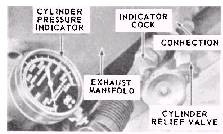 Pressure Indicators In this type of indicator, the cylinder gases enter past a valve into a chamber which leads to a gage. When the pressure above the valve equals that of the cylinder, the valve seats and traps the gas above the valve at its highest pressure, then this pressure is read on the gage. There are several other types of indicators. The one pictured in figure 3-2 is used to take compression readings
